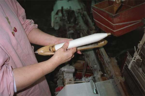 | 2004年11月16日 大阪府和泉市南部 Nov. 16, 2004. South side of Izumi City, Osaka Pref. No. 1-2, 16 MINOLTA New X-700, minolta MD Rokkor 50mm F1.4 AGFA CT precisa. No. 3-15 FUJIFILM TIARA (SUPER EBC FUJINON 28mm F3.5) FUJI SUPERIA Venus 400, program AE. 和泉市南部を山へ向かって車で走っていると, 飛び出た軸が回転している綿織物の工場が目に入る。 例によって飛び込んで,写真を撮らせて欲しいとお願いする。 一体こんなものを写してどうするのだと女主人は訝しげ。 しかし,在宅だったご子息が某大の工学部の院生とくれば話はトントン拍子。 「教養でN先生の人文地理は履修した?泉州の綿織物の話があったでしょ?」 お母さまのご説明付きで撮影させて頂いたのであった。 No. 1 府道沿いの綿織物工場 No. 2 建物から飛び出た軸。 No. 3 小さな綿織物機械が並ぶ工場内部。内部はほこりっぽい。 No. 4 天井に伸びるシャフトにベルトが掛けられ,機械が動く。外に飛び出ていた軸は天井に据え付けられたモーターによって回転させられ,綿織物機械を動かしているのだ。 No. 5 横糸がなくなって止まっていた織る作業が中断していた機械とお母様。 No. 6 箱に用意してある横糸をセットする。これをシャトルと呼ぶと専門家から教えてもらったことがある。この横糸の入ったシャトルがNo. 6の写真の織られた布の右端にある細長い茶色の筒の部分を左右に往復して,布が織られていくのだそうだ。 No. 7 作業場の入口の部屋で動いていたシャトル用の横糸を巻く機械。縦糸も横糸も,専門業者から購入する同じ糸を使うそうだが,シャトルに入れる必要から,専用の小さな軸に別途巻き取る必要があるのだ。 No. 8 機械を反対側から見る。 No. 9 縦糸のリール。このリールで購入されてくる。 Reels of yarn No. 10 奥にある筒が織られたままの布,それを手前のような状態に裁断して誂える。 The products No. 11 織ってたたむ機械。 No. 12 別室にこのような状態で積んでおくようだ。なお,この布が何に使われるかはわからないと言われていた。 No. 13 お母様がお嫁入りする前までは寄宿生の従業員もいたそうだ(おそらく第一次石油危機まで)。 They had some workers until maybe the 1st Oil Crisis. No. 14 工場内に設けられていた従業員の寄宿部屋。 A lodging room for worker. No. 15 工場隅の古い機械。かつてはシーツなども織ることができる大型の機械ばかりだったそうだが,時代の流れとともに小型の機械を導入し,縮小しながらもなお生産を続けているとのこと。従業員もいなくなり,かつては生産の主軸であったお父様は外に稼ぎに行くようになり,朝と夜に機械のセッティングをするのみである。当然息子さんに継がせることもないという。日中,お母様が横糸の継ぎ足しの作業を行うために行っているようなもので,ほとんど利益は出ず,ある程度の年代に達しているお母様が,パートに行く代わりに操業を続けている程度であるという。 2004年12月4日初版 |